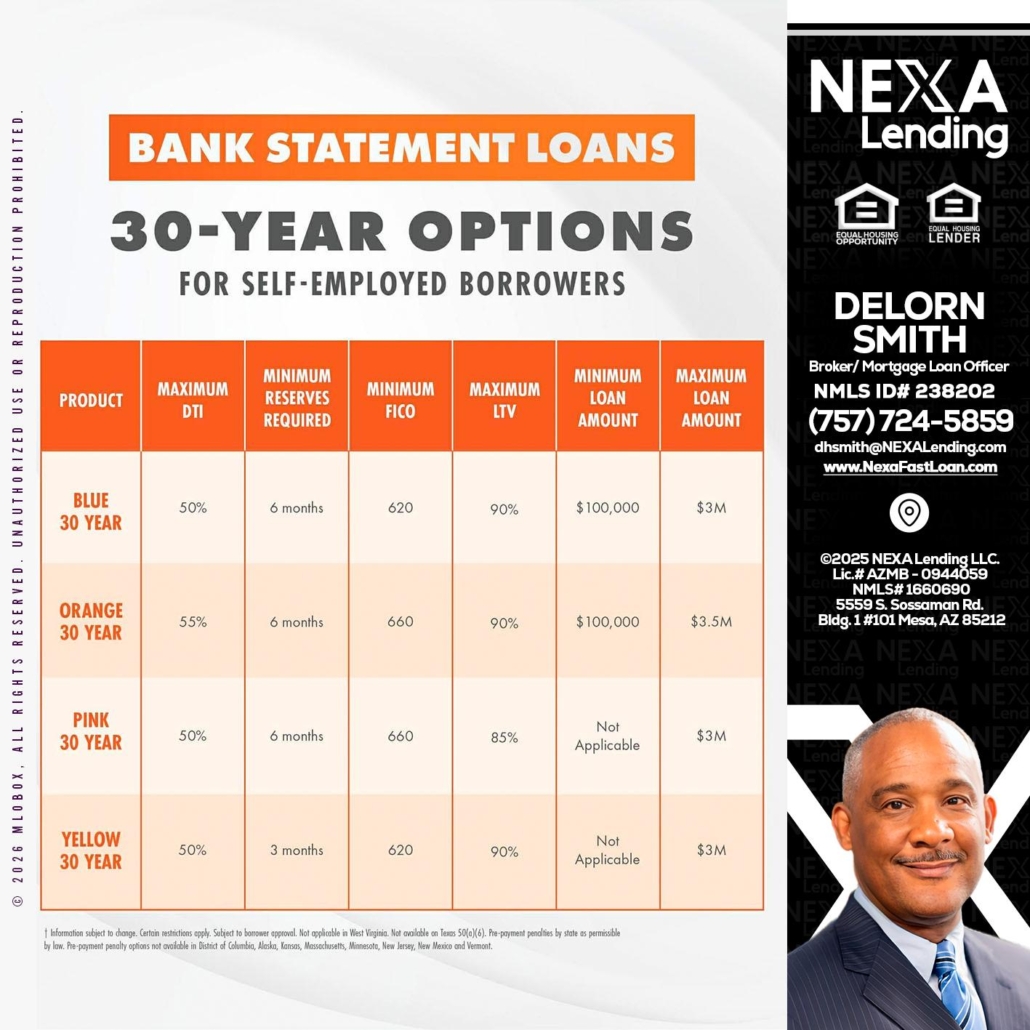 30 YEARS OPTIONS - Delorn Smith -Broker/ Mortgage Loan OfficerHi, my name is Delorn Smith. I’m a Loan Officer with NEXA Lending LLC., offering personalized mortgage solutions, fast customized quotes, great rates and service with integrity.