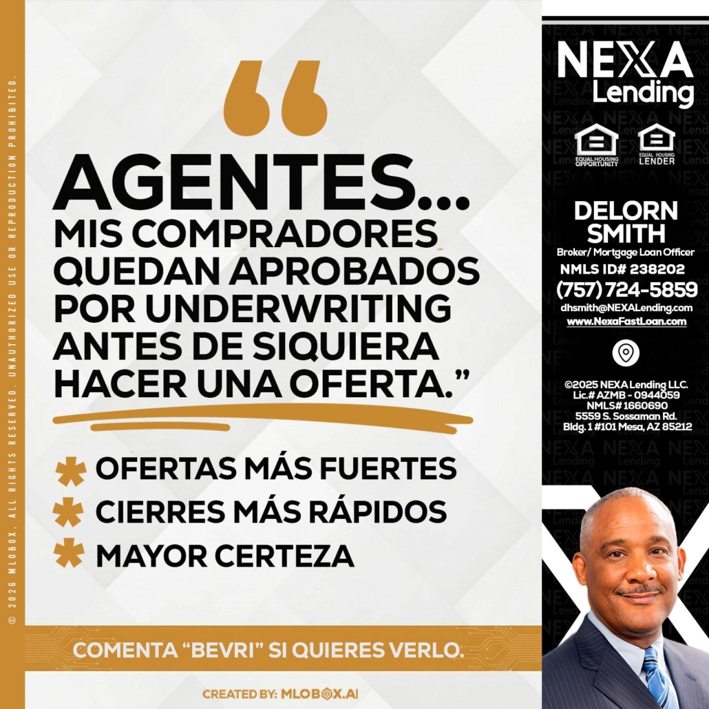 Hi, my name is Delorn Smith. I’m a Loan Officer with NEXA Lending LLC., offering personalized mortgage solutions, fast customized quotes, great rates and service with integrity.