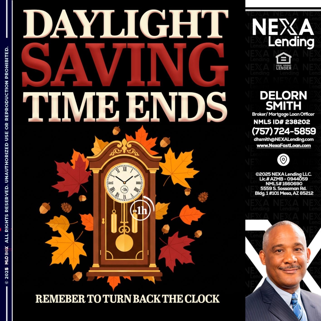 DAYLIGHT SAVINGS - Delorn Smith -Broker/ Mortgage Loan OfficerHi, my name is Delorn Smith. I’m a Loan Officer with NEXA Mortgage LLC., offering personalized mortgage solutions, fast customized quotes, great rates and service with integrity.