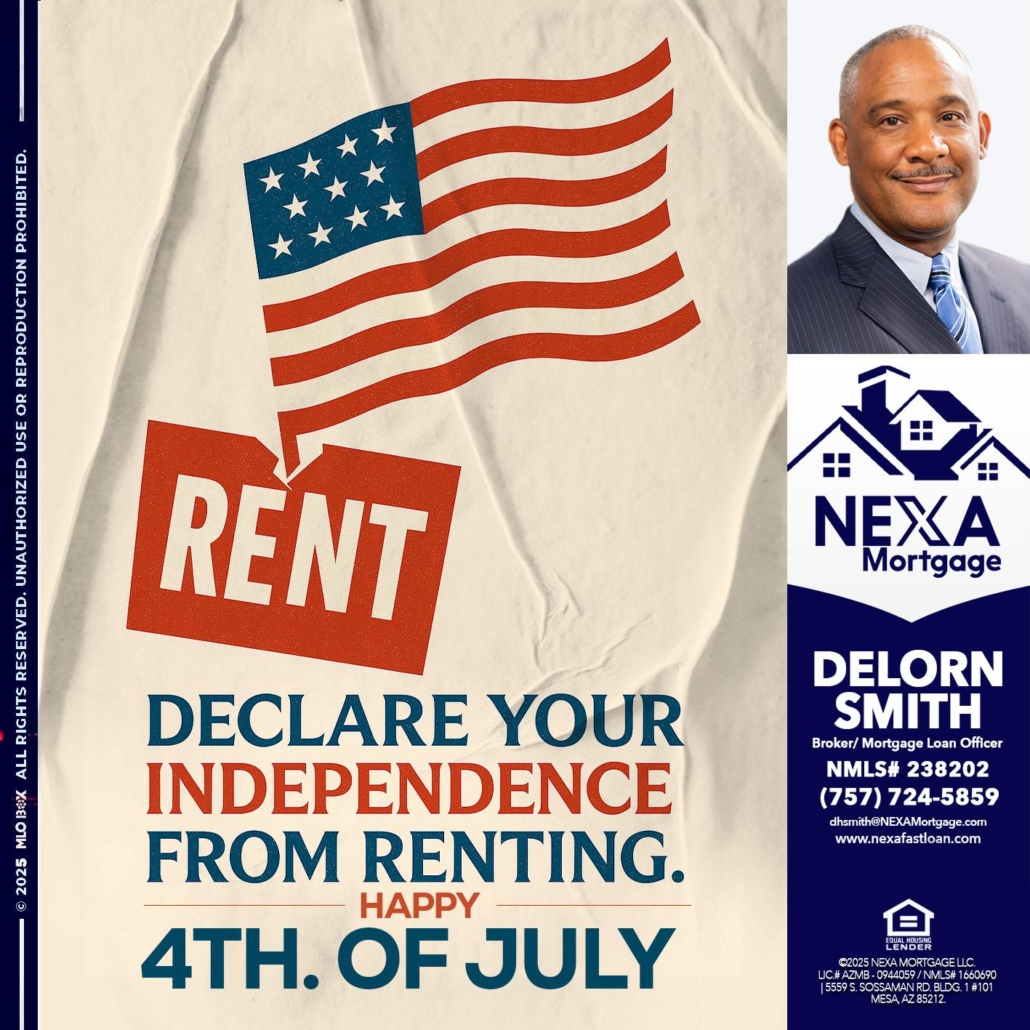DECLARE YOUR INDEPENDENCE - Delorn Smith -Broker/ Mortgage Loan OfficerHi, my name is Delorn Smith. I’m a Loan Officer with NEXA Mortgage LLC., offering personalized mortgage solutions, fast customized quotes, great rates and service with integrity.
