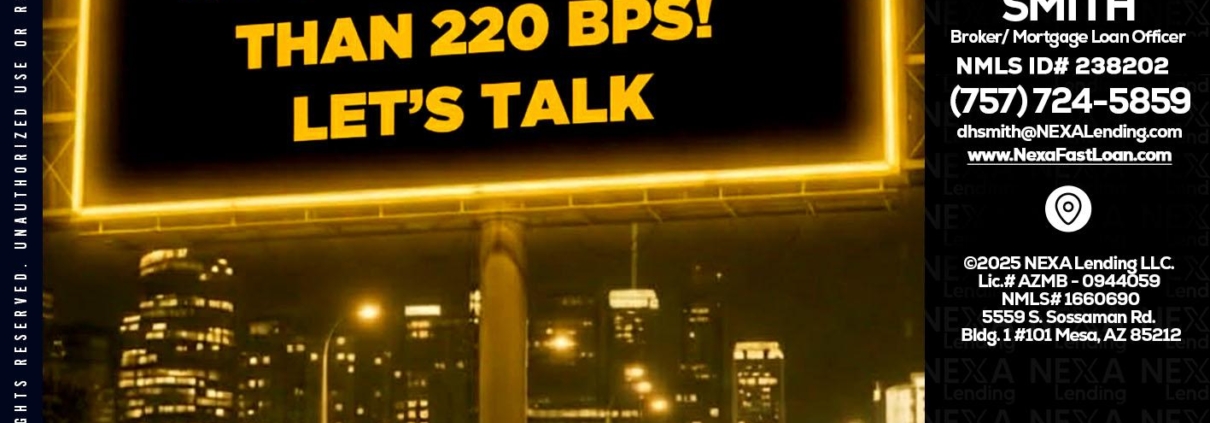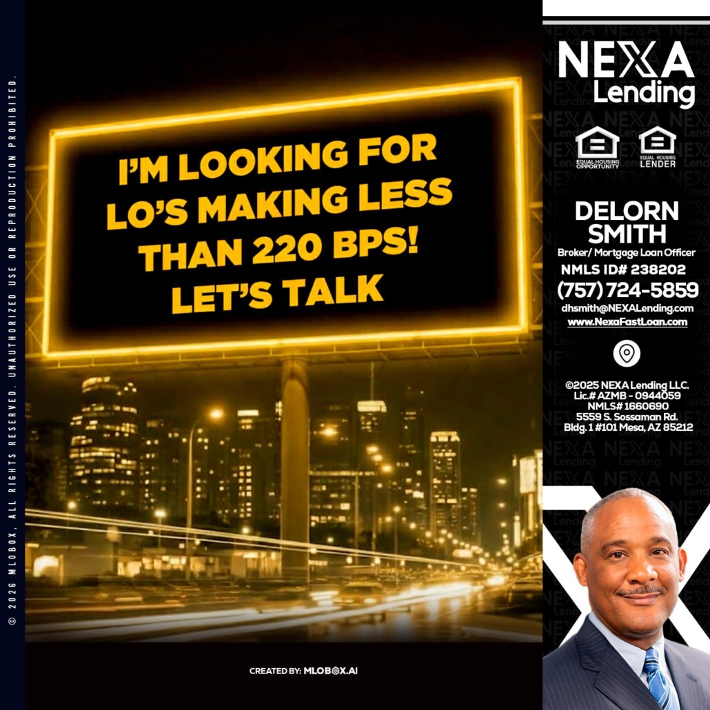 Looking for MLOs - Delorn Smith -Broker/ Mortgage Loan OfficerHi, my name is Delorn Smith. I’m a Loan Officer with NEXA Lending LLC., offering personalized mortgage solutions, fast customized quotes, great rates and service with integrity.