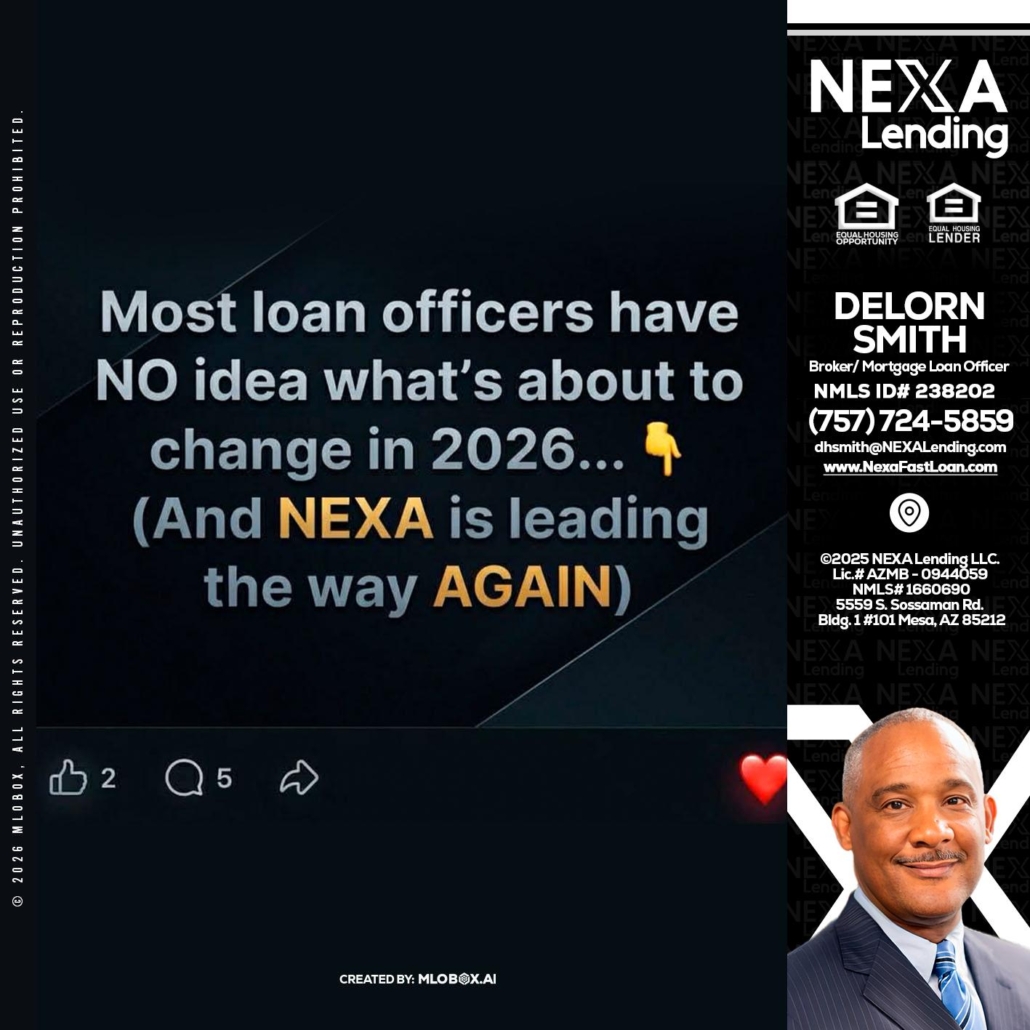 most loan officers - Delorn Smith -Broker/ Mortgage Loan OfficerHi, my name is Delorn Smith. I’m a Loan Officer with NEXA Lending LLC., offering personalized mortgage solutions, fast customized quotes, great rates and service with integrity.