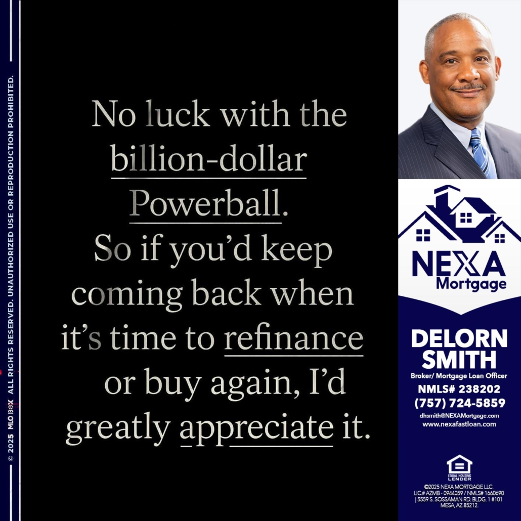 NO LUCK WITH - Delorn Smith -Broker/ Mortgage Loan OfficerHi, my name is Delorn Smith. I’m a Loan Officer with NEXA Mortgage LLC., offering personalized mortgage solutions, fast customized quotes, great rates and service with integrity.