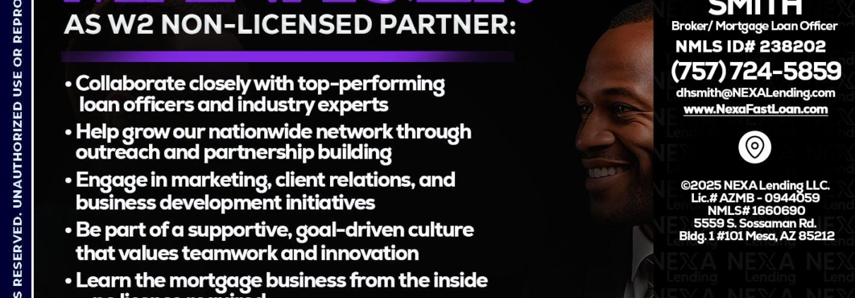 NOW HIRING - Delorn Smith -Broker/ Mortgage Loan OfficerHi, my name is Delorn Smith. I’m a Loan Officer with NEXA Mortgage LLC., offering personalized mortgage solutions, fast customized quotes, great rates and service with integrity.