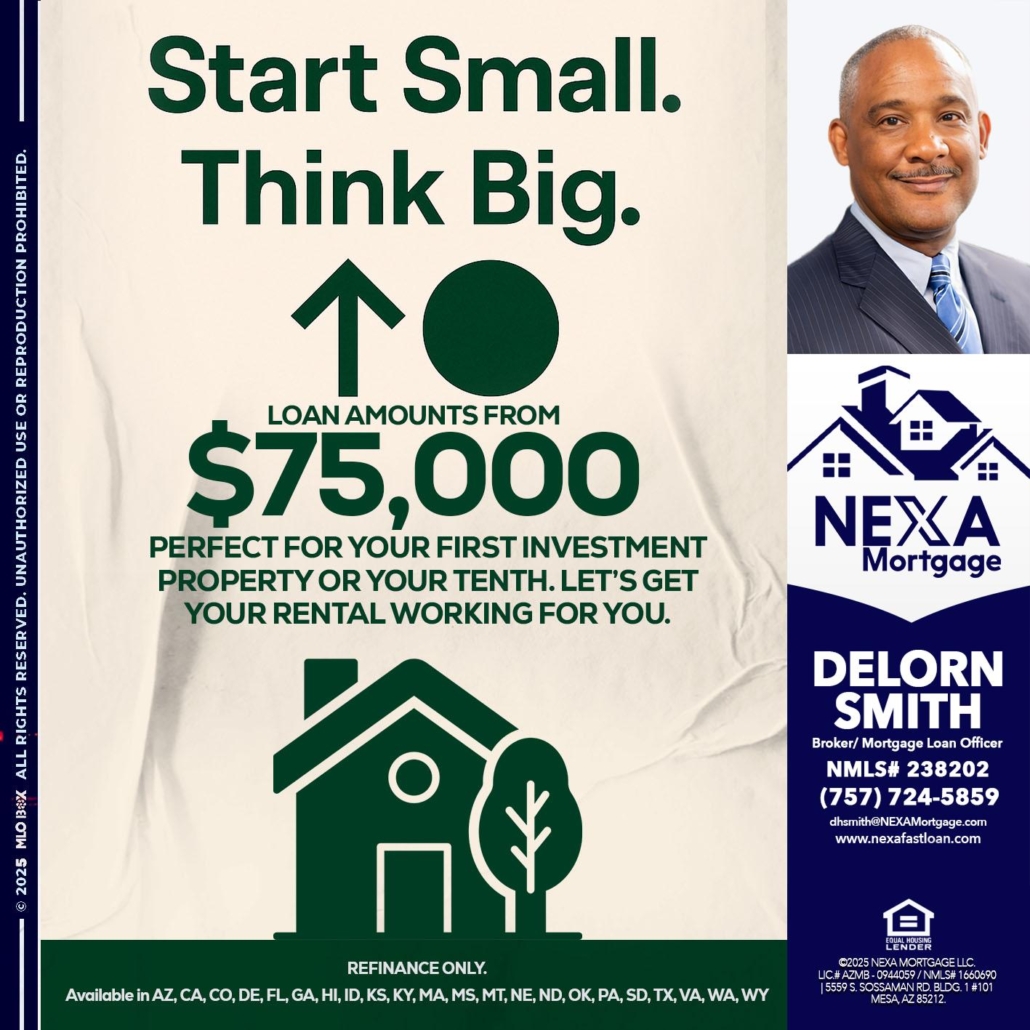 START SMALL - Delorn Smith -Broker/ Mortgage Loan OfficerHi, my name is Delorn Smith. I’m a Loan Officer with NEXA Mortgage LLC., offering personalized mortgage solutions, fast customized quotes, great rates and service with integrity.