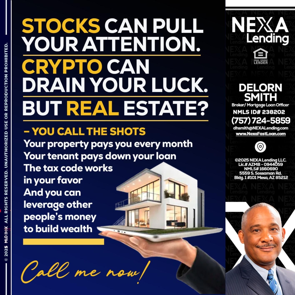 STOCK YOUR - Delorn Smith -Broker/ Mortgage Loan OfficerHi, my name is Delorn Smith. I’m a Loan Officer with NEXA Mortgage LLC., offering personalized mortgage solutions, fast customized quotes, great rates and service with integrity.