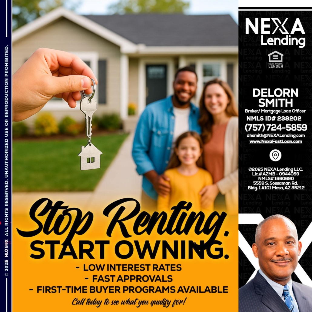 Hi, my name is Delorn Smith. I’m a Loan Officer with NEXA Mortgage LLC., offering personalized mortgage solutions, fast customized quotes, great rates and service with integrity.