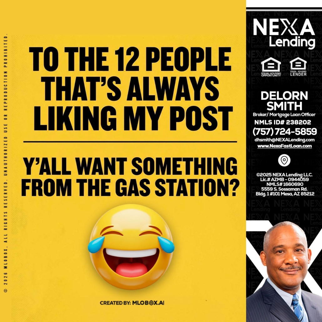 TO THE 12 PEOPLE - Delorn Smith -Broker/ Mortgage Loan OfficerHi, my name is Delorn Smith. I’m a Loan Officer with NEXA Lending LLC., offering personalized mortgage solutions, fast customized quotes, great rates and service with integrity.