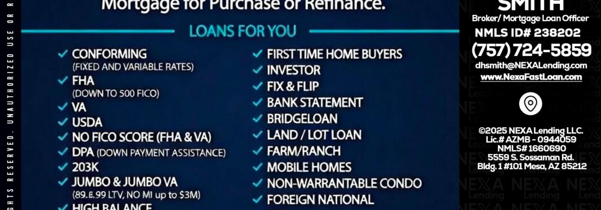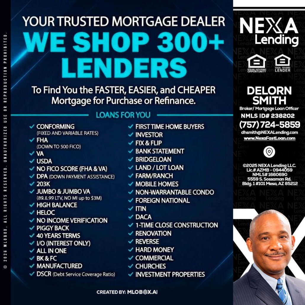 Hi, my name is Delorn Smith. I’m a Loan Officer with NEXA Lending LLC., offering personalized mortgage solutions, fast customized quotes, great rates and service with integrity.